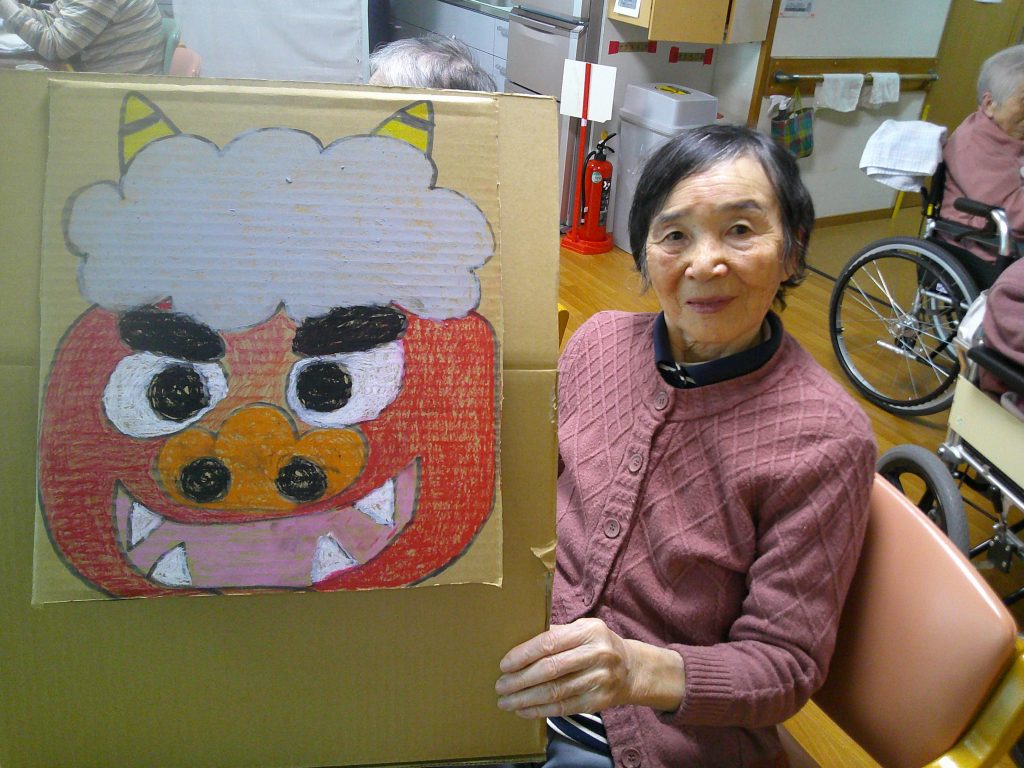 節分にちなんで、鬼の的あてゲームを行いました。皆さま順番にボールを投げ、「鬼は外!」と声をかけながら楽しそうに参加されており、狙いが当たると笑顔や拍手が広がるにぎやかな時間となりました。職員も一緒に盛り上がり、和やかなひとときを過ごすことができました。